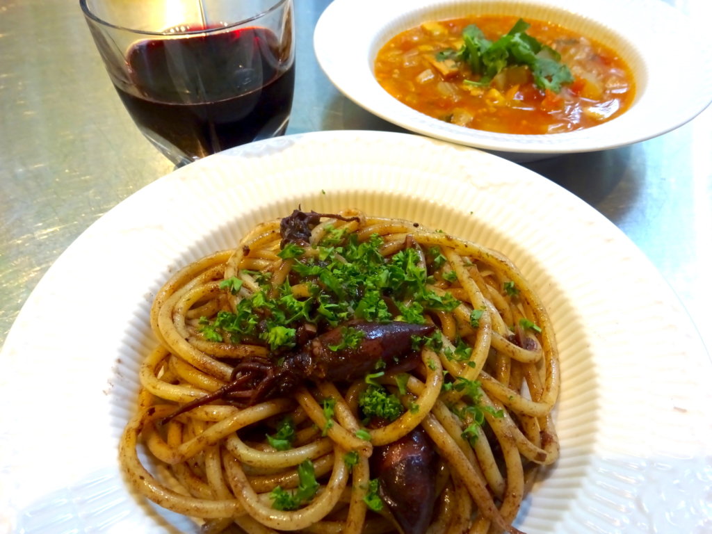 ホタルイカと赤ワインのスパゲッティ。今日はかなり太めのパスタを使ってみた。